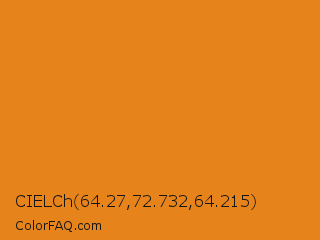 CIELCh 64.27,72.732,64.215 Color is a normal orange color and the nearest color is Zest #e5841b. Hex code #e6831b and RGB value is rgb(230,131,27). In RGB color space, this color is composed of 90% red, 51% green, 11% blue, In CMYK color space, this color is composed of 0% cyan, 43% magenta, 88% yellow , 10% black , In HSL color space, this color has a hue angle of 31° , 80% saturation and 50% lightness.