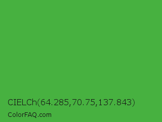 CIELCh 64.285,70.75,137.843 Color is a normal green color and the nearest color is Apple #4fa83d. Hex code #47b140 and RGB value is rgb(71,177,64). In RGB color space, this color is composed of 28% red, 69% green, 25% blue, In CMYK color space, this color is composed of 60% cyan, 0% magenta, 64% yellow , 31% black , In HSL color space, this color has a hue angle of 116° , 47% saturation and 47% lightness.