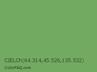 CIELCh 64.314,45.526,135.532 Color is a normal green color and the nearest color is Asparagus Green #7ba05b. Hex code #72aa61 and RGB value is rgb(114,170,97). In RGB color space, this color is composed of 45% red, 67% green, 38% blue, In CMYK color space, this color is composed of 33% cyan, 0% magenta, 43% yellow , 33% black , In HSL color space, this color has a hue angle of 106° , 30% saturation and 52% lightness.