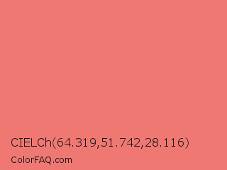 CIELCh 64.319,51.742,28.116 Color is a light red color and the nearest color is Salmon #fa8072. Hex code #f07873 and RGB value is rgb(240,120,115). In RGB color space, this color is composed of 94% red, 47% green, 45% blue, In CMYK color space, this color is composed of 0% cyan, 50% magenta, 52% yellow , 6% black , In HSL color space, this color has a hue angle of 2° , 81% saturation and 70% lightness.