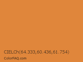 CIELCh 64.333,60.436,61.754 Color is a normal orange color and the nearest color is Tigers Eye #e08d3c. Hex code #e0863b and RGB value is rgb(224,134,59). In RGB color space, this color is composed of 88% red, 53% green, 23% blue, In CMYK color space, this color is composed of 0% cyan, 40% magenta, 74% yellow , 12% black , In HSL color space, this color has a hue angle of 27° , 73% saturation and 55% lightness.