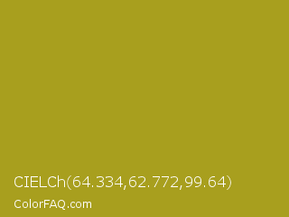 CIELCh 64.334,62.772,99.64 Color is a normal yellow color and the nearest color is Lemon Ginger #ac9e22. Hex code #a89f1e and RGB value is rgb(168,159,30). In RGB color space, this color is composed of 66% red, 62% green, 12% blue, In CMYK color space, this color is composed of 0% cyan, 5% magenta, 82% yellow , 34% black , In HSL color space, this color has a hue angle of 56° , 70% saturation and 39% lightness.