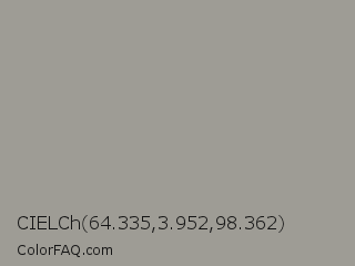 CIELCh 64.335,3.952,98.362 Color is a normal yellow color and the nearest color is Lemon Grass #9b9e8f. Hex code #9e9c95 and RGB value is rgb(158,156,149). In RGB color space, this color is composed of 62% red, 61% green, 58% blue, In CMYK color space, this color is composed of 0% cyan, 1% magenta, 6% yellow , 38% black , In HSL color space, this color has a hue angle of 47° , 4% saturation and 60% lightness.