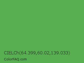 CIELCh 64.399,60.02,139.033 Color is a normal green color and the nearest color is Fruit Salad #4f9d5d. Hex code #57af52 and RGB value is rgb(87,175,82). In RGB color space, this color is composed of 34% red, 69% green, 32% blue, In CMYK color space, this color is composed of 50% cyan, 0% magenta, 53% yellow , 31% black , In HSL color space, this color has a hue angle of 117° , 37% saturation and 50% lightness.