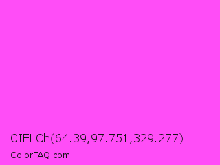 CIELCh 64.39,97.751,329.277 Color is a light magenta color and the nearest color is Pink Flamingo Crayola #ff66ff. Hex code #ff4df7 and RGB value is rgb(255,77,247). In RGB color space, this color is composed of 100% red, 30% green, 97% blue, In CMYK color space, this color is composed of 0% cyan, 70% magenta, 3% yellow , 0% black , In HSL color space, this color has a hue angle of 303° , 100% saturation and 65% lightness.