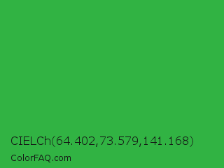 CIELCh 64.402,73.579,141.168 Color is a normal green color and the nearest color is Wageningen Green #34b233. Hex code #31b343 and RGB value is rgb(49,179,67). In RGB color space, this color is composed of 19% red, 70% green, 26% blue, In CMYK color space, this color is composed of 73% cyan, 0% magenta, 63% yellow , 30% black , In HSL color space, this color has a hue angle of 128° , 57% saturation and 45% lightness.