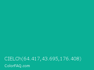 CIELCh 64.417,43.695,176.408 Color is a normal cyan color and the nearest color is Persian Green #00a693. Hex code #0ab096 and RGB value is rgb(10,176,150). In RGB color space, this color is composed of 4% red, 69% green, 59% blue, In CMYK color space, this color is composed of 94% cyan, 0% magenta, 15% yellow , 31% black , In HSL color space, this color has a hue angle of 171° , 89% saturation and 36% lightness.