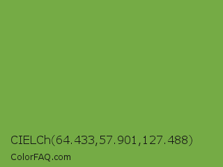 CIELCh 64.433,57.901,127.488 Color is a normal green color and the nearest color is Palm Leaf #6f9940. Hex code #75ab45 and RGB value is rgb(117,171,69). In RGB color space, this color is composed of 46% red, 67% green, 27% blue, In CMYK color space, this color is composed of 32% cyan, 0% magenta, 60% yellow , 33% black , In HSL color space, this color has a hue angle of 92° , 43% saturation and 47% lightness.