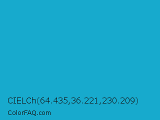 CIELCh 64.435,36.221,230.209 Color is a normal cyan color and the nearest color is Pacific Blue #1ca9c9. Hex code #17aacd and RGB value is rgb(23,170,205). In RGB color space, this color is composed of 9% red, 67% green, 80% blue, In CMYK color space, this color is composed of 89% cyan, 17% magenta, 0% yellow , 20% black , In HSL color space, this color has a hue angle of 192° , 80% saturation and 45% lightness.