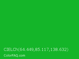 CIELCh 64.449,85.117,138.632 Color is a normal green color and the nearest color is Dark Pastel Green #03c03c. Hex code #14b529 and RGB value is rgb(20,181,41). In RGB color space, this color is composed of 8% red, 71% green, 16% blue, In CMYK color space, this color is composed of 89% cyan, 0% magenta, 77% yellow , 29% black , In HSL color space, this color has a hue angle of 128° , 80% saturation and 39% lightness.