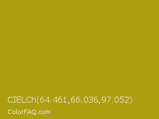 CIELCh 64.461,66.036,97.052 Color is a normal yellow color and the nearest color is Sahara #b7a214. Hex code #ad9e0f and RGB value is rgb(173,158,15). In RGB color space, this color is composed of 68% red, 62% green, 6% blue, In CMYK color space, this color is composed of 0% cyan, 9% magenta, 91% yellow , 32% black , In HSL color space, this color has a hue angle of 54° , 84% saturation and 37% lightness.