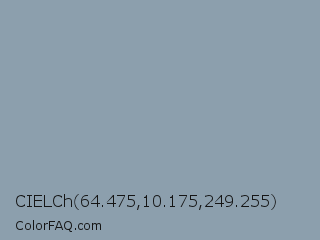 CIELCh 64.475,10.175,249.255 Color is a light blue color and the nearest color is Cadet Grey #91a3b0. Hex code #8c9fad and RGB value is rgb(140,159,173). In RGB color space, this color is composed of 55% red, 62% green, 68% blue, In CMYK color space, this color is composed of 19% cyan, 8% magenta, 0% yellow , 32% black , In HSL color space, this color has a hue angle of 205° , 17% saturation and 61% lightness.