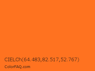 CIELCh 64.483,82.517,52.767 Color is a normal orange color and the nearest color is Pumpkin #ff7518. Hex code #ff7220 and RGB value is rgb(255,114,32). In RGB color space, this color is composed of 100% red, 45% green, 13% blue, In CMYK color space, this color is composed of 0% cyan, 55% magenta, 87% yellow , 0% black , In HSL color space, this color has a hue angle of 22° , 100% saturation and 56% lightness.