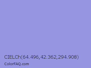 CIELCh 64.496,42.362,294.908 Color is a light indigo color and the nearest color is Dull Lavender #a899e6. Hex code #9695e1 and RGB value is rgb(150,149,225). In RGB color space, this color is composed of 59% red, 58% green, 88% blue, In CMYK color space, this color is composed of 33% cyan, 34% magenta, 0% yellow , 12% black , In HSL color space, this color has a hue angle of 241° , 56% saturation and 73% lightness.
