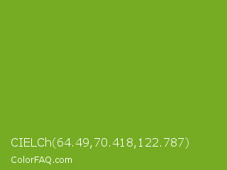 CIELCh 64.49,70.418,122.787 Color is a normal green color and the nearest color is Lima #76bd17. Hex code #75ac23 and RGB value is rgb(117,172,35). In RGB color space, this color is composed of 46% red, 67% green, 14% blue, In CMYK color space, this color is composed of 32% cyan, 0% magenta, 80% yellow , 33% black , In HSL color space, this color has a hue angle of 84° , 66% saturation and 41% lightness.