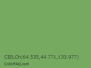 CIELCh 64.535,44.771,133.977 Color is a normal green color and the nearest color is Asparagus Green #7ba05b. Hex code #76aa61 and RGB value is rgb(118,170,97). In RGB color space, this color is composed of 46% red, 67% green, 38% blue, In CMYK color space, this color is composed of 31% cyan, 0% magenta, 43% yellow , 33% black , In HSL color space, this color has a hue angle of 103° , 30% saturation and 52% lightness.
