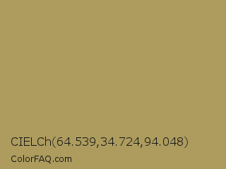 CIELCh 64.539,34.724,94.048 Color is a normal yellow color and the nearest color is Teak #b19461. Hex code #ad9c5e and RGB value is rgb(173,156,94). In RGB color space, this color is composed of 68% red, 61% green, 37% blue, In CMYK color space, this color is composed of 0% cyan, 10% magenta, 46% yellow , 32% black , In HSL color space, this color has a hue angle of 47° , 33% saturation and 52% lightness.