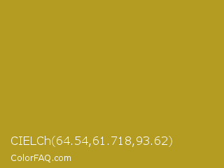 CIELCh 64.54,61.718,93.62 Color is a normal yellow color and the nearest color is Lucky #af9f1c. Hex code #b39c21 and RGB value is rgb(179,156,33). In RGB color space, this color is composed of 70% red, 61% green, 13% blue, In CMYK color space, this color is composed of 0% cyan, 13% magenta, 82% yellow , 30% black , In HSL color space, this color has a hue angle of 51° , 69% saturation and 42% lightness.