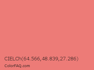 CIELCh 64.566,48.839,27.286 Color is a light red color and the nearest color is Light Coral #f08080. Hex code #ed7b77 and RGB value is rgb(237,123,119). In RGB color space, this color is composed of 93% red, 48% green, 47% blue, In CMYK color space, this color is composed of 0% cyan, 48% magenta, 50% yellow , 7% black , In HSL color space, this color has a hue angle of 2° , 77% saturation and 70% lightness.