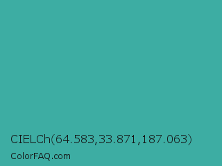CIELCh 64.583,33.871,187.063 Color is a normal cyan color and the nearest color is Keppel #3ab09e. Hex code #3dada3 and RGB value is rgb(61,173,163). In RGB color space, this color is composed of 24% red, 68% green, 64% blue, In CMYK color space, this color is composed of 65% cyan, 0% magenta, 6% yellow , 32% black , In HSL color space, this color has a hue angle of 175° , 48% saturation and 46% lightness.