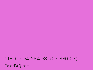 CIELCh 64.584,68.707,330.03 Color is a light magenta color and the nearest color is Orchid #da70d6. Hex code #e670db and RGB value is rgb(230,112,219). In RGB color space, this color is composed of 90% red, 44% green, 86% blue, In CMYK color space, this color is composed of 0% cyan, 51% magenta, 5% yellow , 10% black , In HSL color space, this color has a hue angle of 306° , 70% saturation and 67% lightness.
