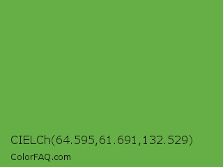 CIELCh 64.595,61.691,132.529 Color is a normal green color and the nearest color is Green RYB #66b032. Hex code #66ae46 and RGB value is rgb(102,174,70). In RGB color space, this color is composed of 40% red, 68% green, 27% blue, In CMYK color space, this color is composed of 41% cyan, 0% magenta, 60% yellow , 32% black , In HSL color space, this color has a hue angle of 102° , 43% saturation and 48% lightness.