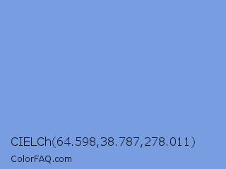 CIELCh 64.598,38.787,278.011 Color is a light blue color and the nearest color is Vista Blue #7c9ed9. Hex code #789de1 and RGB value is rgb(120,157,225). In RGB color space, this color is composed of 47% red, 62% green, 88% blue, In CMYK color space, this color is composed of 47% cyan, 30% magenta, 0% yellow , 12% black , In HSL color space, this color has a hue angle of 219° , 64% saturation and 68% lightness.