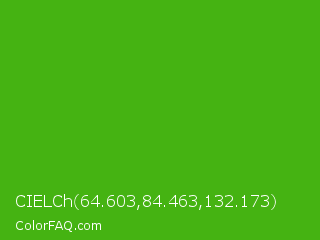 CIELCh 64.603,84.463,132.173 Color is a normal green color and the nearest color is Kelly Green #4cbb17. Hex code #45b312 and RGB value is rgb(69,179,18). In RGB color space, this color is composed of 27% red, 70% green, 7% blue, In CMYK color space, this color is composed of 61% cyan, 0% magenta, 90% yellow , 30% black , In HSL color space, this color has a hue angle of 101° , 82% saturation and 39% lightness.