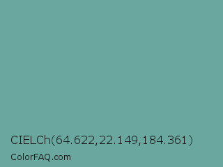 CIELCh 64.622,22.149,184.361 Color is a normal cyan color and the nearest color is Green Sheen #6eaea1. Hex code #6aa89f and RGB value is rgb(106,168,159). In RGB color space, this color is composed of 42% red, 66% green, 62% blue, In CMYK color space, this color is composed of 37% cyan, 0% magenta, 5% yellow , 34% black , In HSL color space, this color has a hue angle of 171° , 26% saturation and 54% lightness.