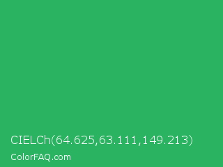 CIELCh 64.625,63.111,149.213 Color is a normal green color and the nearest color is Chateau Green #40a860. Hex code #2ab360 and RGB value is rgb(42,179,96). In RGB color space, this color is composed of 16% red, 70% green, 38% blue, In CMYK color space, this color is composed of 77% cyan, 0% magenta, 46% yellow , 30% black , In HSL color space, this color has a hue angle of 144° , 62% saturation and 43% lightness.