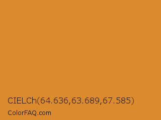 CIELCh 64.636,63.689,67.585 Color is a normal orange color and the nearest color is Tigers Eye #e08d3c. Hex code #dc8a2e and RGB value is rgb(220,138,46). In RGB color space, this color is composed of 86% red, 54% green, 18% blue, In CMYK color space, this color is composed of 0% cyan, 37% magenta, 79% yellow , 14% black , In HSL color space, this color has a hue angle of 32° , 71% saturation and 52% lightness.