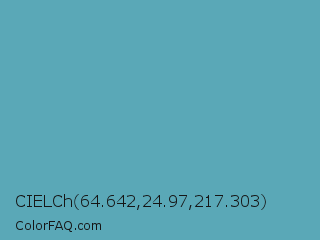 CIELCh 64.642,24.97,217.303 Color is a normal cyan color and the nearest color is Fountain Blue #56b4be. Hex code #5aa8b7 and RGB value is rgb(90,168,183). In RGB color space, this color is composed of 35% red, 66% green, 72% blue, In CMYK color space, this color is composed of 51% cyan, 8% magenta, 0% yellow , 28% black , In HSL color space, this color has a hue angle of 190° , 39% saturation and 54% lightness.