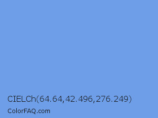 CIELCh 64.64,42.496,276.249 Color is a light blue color and the nearest color is Little Boy Blue #6ca0dc. Hex code #6e9ee8 and RGB value is rgb(110,158,232). In RGB color space, this color is composed of 43% red, 62% green, 91% blue, In CMYK color space, this color is composed of 53% cyan, 32% magenta, 0% yellow , 9% black , In HSL color space, this color has a hue angle of 216° , 73% saturation and 67% lightness.