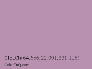 CIELCh 64.656,22.991,331.116 Color is a light magenta color and the nearest color is Glossy Grape #ab92b3. Hex code #b891b1 and RGB value is rgb(184,145,177). In RGB color space, this color is composed of 72% red, 57% green, 69% blue, In CMYK color space, this color is composed of 0% cyan, 21% magenta, 4% yellow , 28% black , In HSL color space, this color has a hue angle of 311° , 22% saturation and 65% lightness.