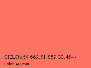 CIELCh 64.669,61.859,33.464 Color is a light red color and the nearest color is Bittersweet #fe6f5e. Hex code #fc7263 and RGB value is rgb(252,114,99). In RGB color space, this color is composed of 99% red, 45% green, 39% blue, In CMYK color space, this color is composed of 0% cyan, 55% magenta, 61% yellow , 1% black , In HSL color space, this color has a hue angle of 6° , 96% saturation and 69% lightness.