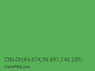 CIELCh 64.674,59.697,140.235 Color is a normal green color and the nearest color is Fruit Salad #4f9d5d. Hex code #55b055 and RGB value is rgb(85,176,85). In RGB color space, this color is composed of 33% red, 69% green, 33% blue, In CMYK color space, this color is composed of 52% cyan, 0% magenta, 52% yellow , 31% black , In HSL color space, this color has a hue angle of 120° , 37% saturation and 51% lightness.