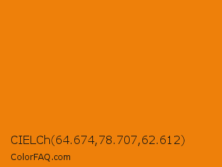 CIELCh 64.674,78.707,62.612 Color is a normal orange color and the nearest color is Tahiti Gold #e97c07. Hex code #ee800a and RGB value is rgb(238,128,10). In RGB color space, this color is composed of 93% red, 50% green, 4% blue, In CMYK color space, this color is composed of 0% cyan, 46% magenta, 96% yellow , 7% black , In HSL color space, this color has a hue angle of 31° , 92% saturation and 49% lightness.