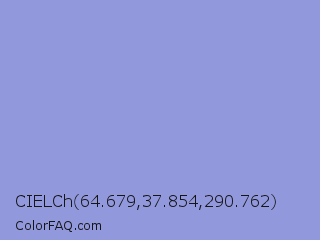 CIELCh 64.679,37.854,290.762 Color is a light blue color and the nearest color is Ceil #92a1cf. Hex code #9198dc and RGB value is rgb(145,152,220). In RGB color space, this color is composed of 57% red, 60% green, 86% blue, In CMYK color space, this color is composed of 34% cyan, 31% magenta, 0% yellow , 14% black , In HSL color space, this color has a hue angle of 234° , 52% saturation and 72% lightness.