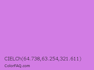 CIELCh 64.738,63.254,321.611 Color is a light purple color and the nearest color is French Mauve #d473d4. Hex code #d27ce4 and RGB value is rgb(210,124,228). In RGB color space, this color is composed of 82% red, 49% green, 89% blue, In CMYK color space, this color is composed of 8% cyan, 46% magenta, 0% yellow , 11% black , In HSL color space, this color has a hue angle of 290° , 66% saturation and 69% lightness.