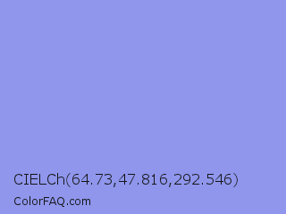 CIELCh 64.73,47.816,292.546 Color is a light blue color and the nearest color is Portage #8b9fee. Hex code #8f96ec and RGB value is rgb(143,150,236). In RGB color space, this color is composed of 56% red, 59% green, 93% blue, In CMYK color space, this color is composed of 39% cyan, 36% magenta, 0% yellow , 7% black , In HSL color space, this color has a hue angle of 235° , 71% saturation and 74% lightness.