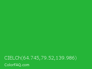 CIELCh 64.745,79.52,139.986 Color is a normal green color and the nearest color is Wageningen Green #34b233. Hex code #25b538 and RGB value is rgb(37,181,56). In RGB color space, this color is composed of 15% red, 71% green, 22% blue, In CMYK color space, this color is composed of 80% cyan, 0% magenta, 69% yellow , 29% black , In HSL color space, this color has a hue angle of 128° , 66% saturation and 43% lightness.