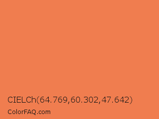 CIELCh 64.769,60.302,47.642 Color is a light orange color and the nearest color is Mandarin #f37a48. Hex code #f07d4f and RGB value is rgb(240,125,79). In RGB color space, this color is composed of 94% red, 49% green, 31% blue, In CMYK color space, this color is composed of 0% cyan, 48% magenta, 67% yellow , 6% black , In HSL color space, this color has a hue angle of 17° , 84% saturation and 63% lightness.
