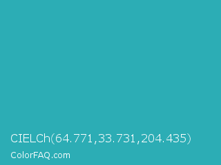 CIELCh 64.771,33.731,204.435 Color is a normal cyan color and the nearest color is Light Sea Green #20b2aa. Hex code #2cadb5 and RGB value is rgb(44,173,181). In RGB color space, this color is composed of 17% red, 68% green, 71% blue, In CMYK color space, this color is composed of 76% cyan, 4% magenta, 0% yellow , 29% black , In HSL color space, this color has a hue angle of 184° , 61% saturation and 44% lightness.