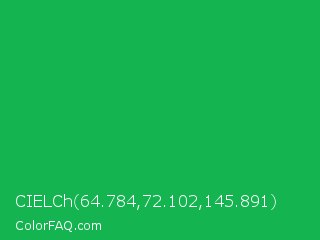 CIELCh 64.784,72.102,145.891 Color is a normal green color and the nearest color is Green Pantone #00ad43. Hex code #14b550 and RGB value is rgb(20,181,80). In RGB color space, this color is composed of 8% red, 71% green, 31% blue, In CMYK color space, this color is composed of 89% cyan, 0% magenta, 56% yellow , 29% black , In HSL color space, this color has a hue angle of 142° , 80% saturation and 39% lightness.