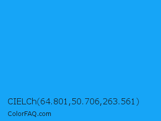 CIELCh 64.801,50.706,263.561 Color is a normal blue color and the nearest color is Button Blue #24a0ed. Hex code #16a5f7 and RGB value is rgb(22,165,247). In RGB color space, this color is composed of 9% red, 65% green, 97% blue, In CMYK color space, this color is composed of 91% cyan, 33% magenta, 0% yellow , 3% black , In HSL color space, this color has a hue angle of 202° , 93% saturation and 53% lightness.
