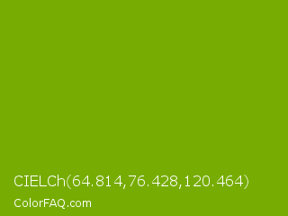 CIELCh 64.814,76.428,120.464 Color is a normal lime color and the nearest color is Limeade #6f9d02. Hex code #77ad02 and RGB value is rgb(119,173,2). In RGB color space, this color is composed of 47% red, 68% green, 1% blue, In CMYK color space, this color is composed of 31% cyan, 0% magenta, 99% yellow , 32% black , In HSL color space, this color has a hue angle of 79° , 98% saturation and 34% lightness.