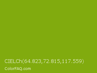 CIELCh 64.823,72.815,117.559 Color is a normal lime color and the nearest color is Apple Green #8db600. Hex code #81ab0e and RGB value is rgb(129,171,14). In RGB color space, this color is composed of 51% red, 67% green, 5% blue, In CMYK color space, this color is composed of 25% cyan, 0% magenta, 92% yellow , 33% black , In HSL color space, this color has a hue angle of 76° , 85% saturation and 36% lightness.