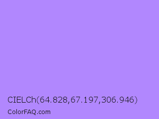 CIELCh 64.828,67.197,306.946 Color is a light violet color and the nearest color is Dull Lavender #a899e6. Hex code #b187fe and RGB value is rgb(177,135,254). In RGB color space, this color is composed of 69% red, 53% green, 100% blue, In CMYK color space, this color is composed of 30% cyan, 47% magenta, 0% yellow , 0% black , In HSL color space, this color has a hue angle of 261° , 98% saturation and 76% lightness.