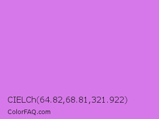 CIELCh 64.82,68.81,321.922 Color is a light purple color and the nearest color is Orchid #da70d6. Hex code #d778ea and RGB value is rgb(215,120,234). In RGB color space, this color is composed of 84% red, 47% green, 92% blue, In CMYK color space, this color is composed of 8% cyan, 49% magenta, 0% yellow , 8% black , In HSL color space, this color has a hue angle of 290° , 73% saturation and 69% lightness.