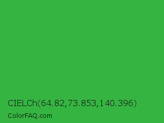 CIELCh 64.82,73.853,140.396 Color is a normal green color and the nearest color is Wageningen Green #34b233. Hex code #36b442 and RGB value is rgb(54,180,66). In RGB color space, this color is composed of 21% red, 71% green, 26% blue, In CMYK color space, this color is composed of 70% cyan, 0% magenta, 63% yellow , 29% black , In HSL color space, this color has a hue angle of 126° , 54% saturation and 46% lightness.
